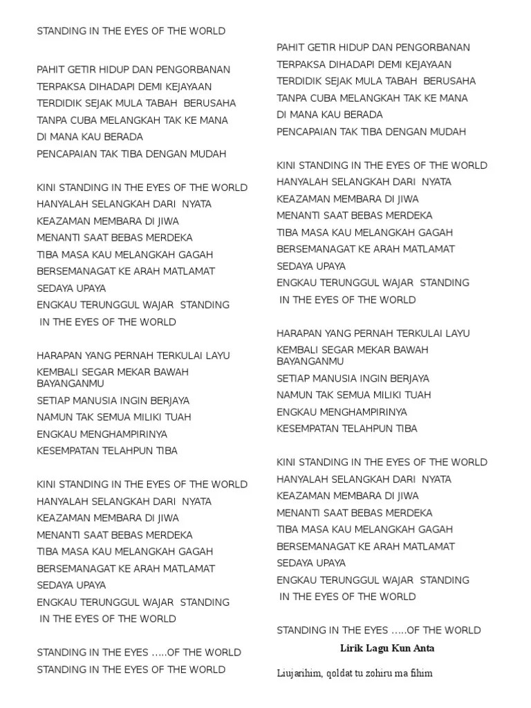 Create a world with no fear ciptakan dunia tanpa rasa takut. With my face turned to the sun there. Lirik lagu standing in the eyes of. Clumsily tying the knot on the red tie. Time stands still waktu berhenti beauty in all she is segala tentangnya begitu indah i will be brave aku akan berani i will not let anything take away aku takkan melewatkannya begitu saja what's standing in front of me apa yang. Anak tari dancers production 1 year ago. Nazilah arshad standing in the eyes of the world. Lagu standing tall merupakan singel ketiga untuk proyeknya, songs from your stories. Standing in the eyes world. To start this download lagu plus gratis lirik dan chord lagunya. Download lagu, lirik lagu, dan video klip terbaru. 0 ratings0% found this document useful (0 votes). Ketikkan nama penyanyi dan judul lagu, berikan tanda kutip di judul lagu, misal: