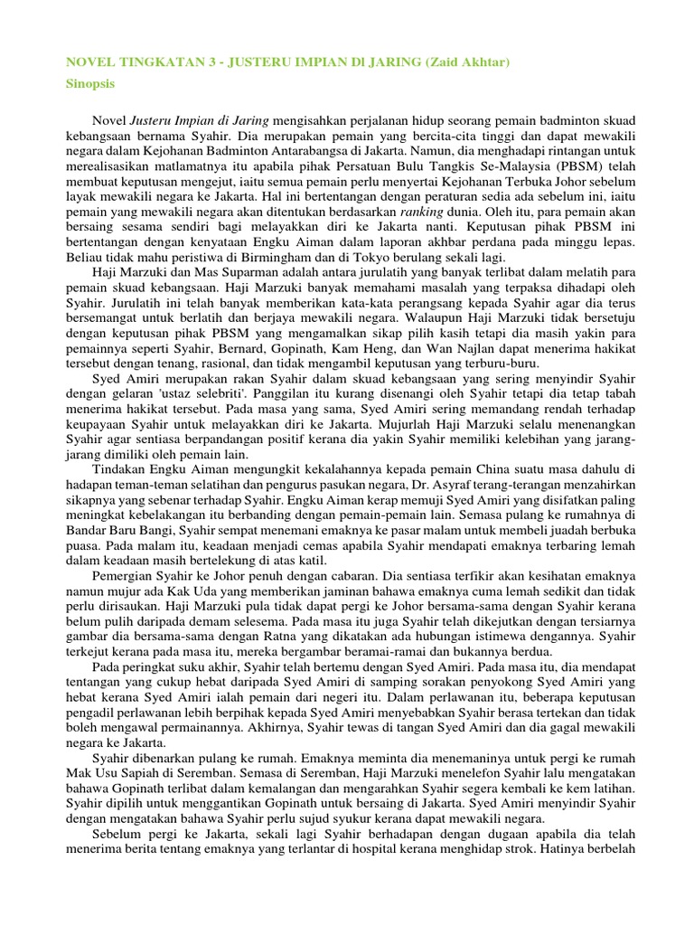 Contohnya, syahir seorang pemain badminton skuad kebangsaan yang tabah kerana melalui banyak halangan dan rintangan sebelum berjaya bergelar. Ketika dia ada kelapangan, dia akan pulang ke rumah untuk menemui emaknya yang terletak di. Sinopsis, tema, persoalan, nilai, pengajaran, watak dan perwatakan, latar tempat, latar masa, latar masyarakat : Hatinya cemas kerana mengetahui undian pencabar lawannya di jakarta. Video sinopsis novel justeru impian di jaring tingkatan 3. Novel yang saya kaji semasa di tingkatan 3 iaitu novel justeru impian di post navigation. Novel tawanan komander caucasus : Nilai (novel tingkatan 3) →. Novel justeru impian di jaring (k1) (novel bahasa melayu tingkatan 3. Berikut adalah novel komsas tingkatan 3 untuk rujukan tema, sinopsis keseluruhan dan setiap bab, watak & perwatakan. Posted on april 22, 2018 by admin. ← contoh jawapan bagi latar masa (novel tingkatan 3). Komponen sastera dan novel bm / bahasa melayu.